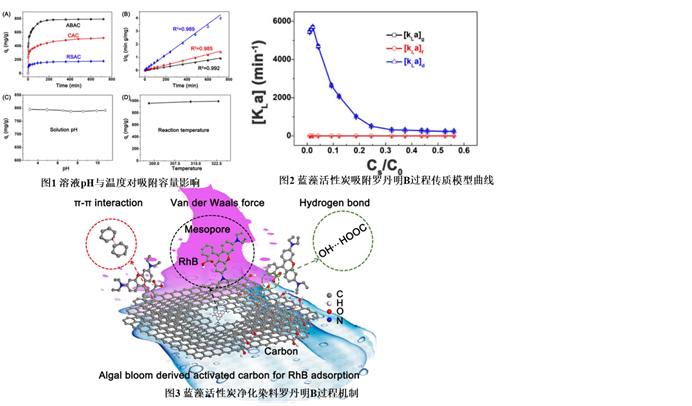 发展低成本、高效且能够宽范围适应复杂条件的吸附剂对构建高效废水处理系统十分必要。本研究以废弃蓝藻生物质为原料,成功制备出耐受溶液pH与温度的低成本蓝藻活性炭吸附剂,能够高效净化染料废水。本研究以罗丹明B为模式染料,首先比较不同生物质类型活性炭对罗丹明B吸附性能,发现蓝藻活性炭性能最佳,远高于油菜秸秆活性炭与商业化活性炭,并且证实了蓝藻活性炭对溶液pH与温度具有良好的适应性。利用传质模型研究蓝藻活性炭吸附罗丹明B传质过程,表明蓝藻活性炭吸附罗丹明B过程传质阻抗主要依赖外部质量转移。最后,基于吸附热动力学实验、吸附前后蓝藻活性炭FTIR、Raman与XPS分析,阐明了蓝藻活性炭吸附和有效去除罗丹明B过程机制。