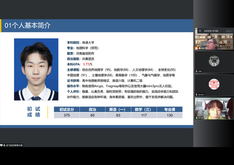 为提高2023届地理科学(师范)毕业生考研复试成功率,提升员工的面试能力和技巧。考虑到部分考生仍处于教育实习岗位,3月22日晚地理系在线于举办了考研模拟面试活动。由地理系董进国教授和王丹教授分别担任组长,特邀周侗、程成、叶磊、李焕等4位教师担任模拟面试主考官,对进入考研复试环节的学子进行面试针对性辅导。