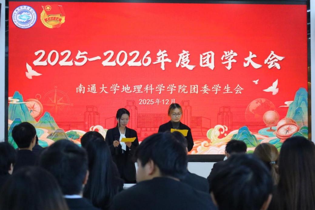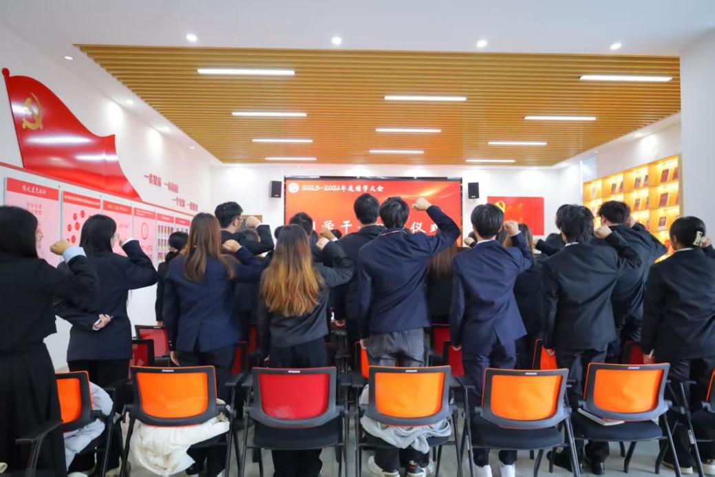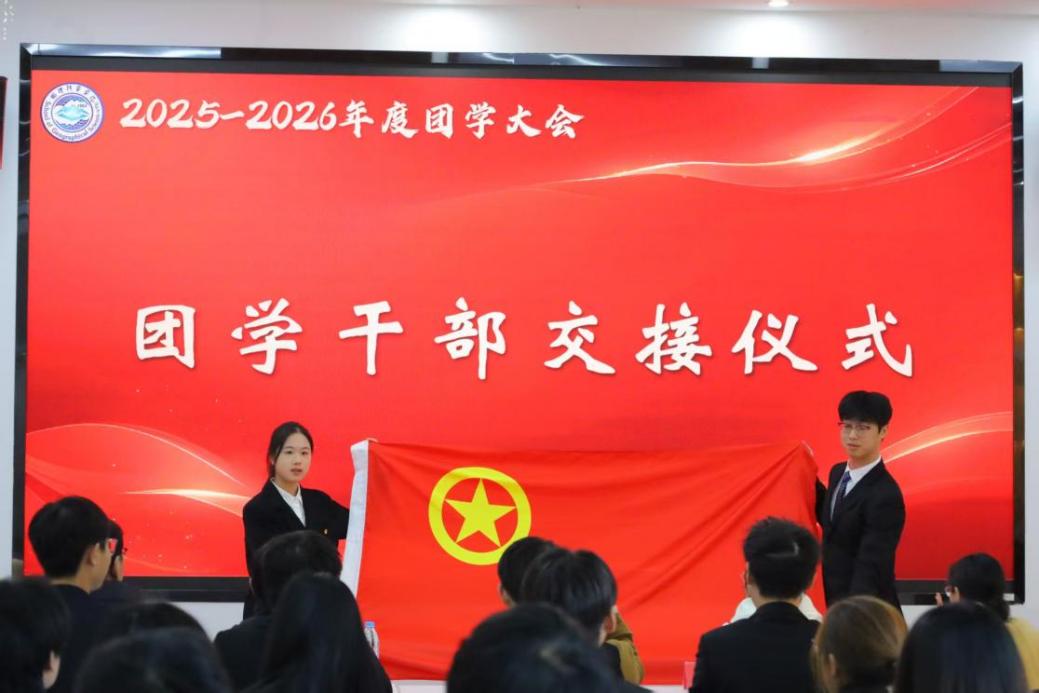 汇报结束后,大会举行了庄重的团旗交接仪式。新任主席团代表史佳怡从杨子腾手中郑重接过团旗。鲜红的团旗在灯光下熠熠生辉,既承载着过往的荣誉,更传递着未来的责任。随后,史佳怡带领全体新一届团委员工会成员进行庄严宣誓。